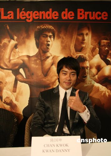 電視連續劇《李小龍傳奇》是中國國際電視總公司為明年奧運會推出的電視劇大片。該片11月19日晚在巴黎舉行造勢活動。因為“長得像、有武功、會表演”而在劇中出演李小龍的陳國坤也現身巴黎。這部投資額達五百萬歐元的電視劇,劇中場面遍及中、美、歐三大洲。電視劇分五十集,現已殺青。中新社發 鐘誠 攝