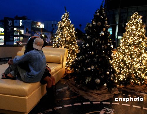 當地時間十二月二十四日,圣誕節前夕,洛杉磯一對有情人在圣誕樹美妙的燈光下談情說愛,享受浪漫時光。中新社發 賈國榮 攝