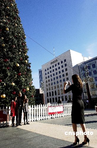 當地時間十二月二十五日,圣誕節的舊金山天氣晴朗。圖為一家美國人和樹立在舊金山聯合廣場上的巨大圣誕樹合影。中新社發 陳鋼 攝