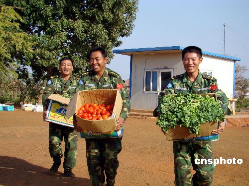 當(dāng)?shù)貢r(shí)間2月3日下午,中國(guó)駐蘇丹大使李成文在董建東武官的陪同下,帶領(lǐng)中國(guó)石油天然氣集團(tuán)公司代表一行5人乘專機(jī)前往蘇丹南部城市瓦烏,慰問中國(guó)駐蘇丹維和工兵、運(yùn)輸、醫(yī)療分隊(duì)。李大使代表中國(guó)駐蘇丹大使館向維和部隊(duì)贈(zèng)送一面鑲有“牢記祖國(guó)重托、維護(hù)世界和平”字樣的錦旗及慰問品。隨同的中國(guó)石油天然氣集團(tuán)公司代表向維和部隊(duì)贈(zèng)送1000余公斤新鮮蔬菜。中新社發(fā) 劉恩海 攝