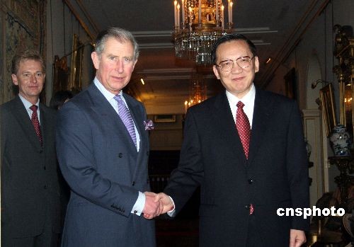 當地時間十九日下午,英國王儲查爾斯在其官邸克拉倫斯宮會見正在此間訪問的中國國務委員唐家璇(右)。中新社發 李鵬 攝