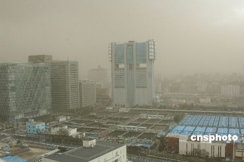 2月23日午后,東京出現大風天氣,瞬間風力達到15.9公里,一時間,黃沙漫天。圖為東京都港區的高層建筑群浸潤在黃色沙塵中。中新社發 滕劍峰 攝