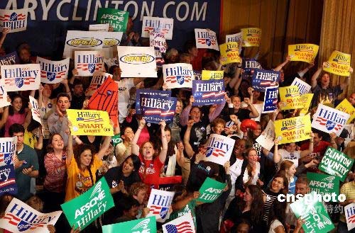 前美國第一夫人希拉里4月22日在賓夕法尼亞州贏得民主黨總統侯選人提名戰的一場關鍵性勝利。圖為希拉里的支持者在費城舉行的慶功會上歡呼慶祝。中新社發 李靜 攝