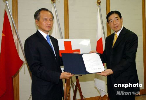 6月20日,中國(guó)駐日大使崔天凱前往位于東京的日本紅十字會(huì)代表中國(guó)政府向日本巖手宮城地震災(zāi)區(qū)提供10萬美金的救災(zāi)捐款,并再次對(duì)地震災(zāi)區(qū)人民表示慰問。圖為崔天凱與日本紅十字會(huì)會(huì)長(zhǎng)近衛(wèi)忠煇。中新社發(fā) 朱沿華 攝