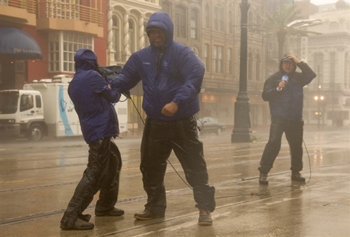 9月1日,在美國路易斯安那州的新奧爾良,當地氣象頻道的工作人員在“古斯塔夫”帶來的風雨中進行報道。
