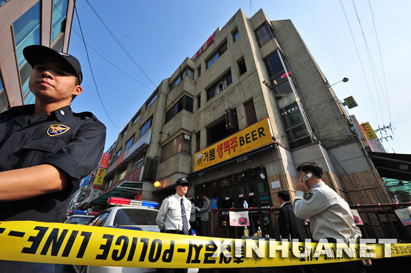 10月20日,在韓國首爾市江南區論峴洞一家旅館外,警察在兇案現場拉起警戒線。新華社/紐西斯通訊社