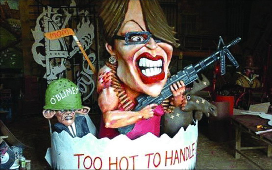 這位阿拉斯加州州長的巨型肖像頗為夸張:她手握一挺機槍,兩臂肌肉發(fā)達而強健,嘴唇上涂抹著濃艷的口紅,還露出了惡作劇式的微笑。她的身邊還立著一只美國駝鹿雕塑,身前的標語上寫著“燙手山芋”的字樣。在佩林雕像的旁邊,是民主黨總統(tǒng)候選人奧巴馬的一個小號雕像,他頭戴一頂戰(zhàn)斗鋼盔,顯得大為遜色。盡管下著傾盆大雨,里面填滿了煙花的佩林雕像被引爆后,瞬間就炸得灰飛煙滅。