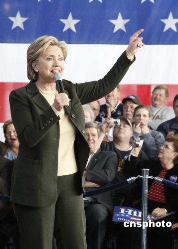 圖為民主黨參選人希拉里在參加2008年大選初選時演講。 中新社發 李靜 攝