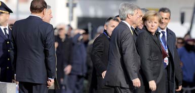 貝盧斯科尼撇開歡迎委員會的工作人員,藏在一個街燈柱后面。當德國總理默克爾走下專車,要進入他們會面的地區委員會總部時,他突然從街燈柱后面跳出來,嘴里還喊著“咕咕”。據說默克爾看起來很開心,與貝盧斯科尼擁抱,并且親切地稱其“西爾維奧” 。