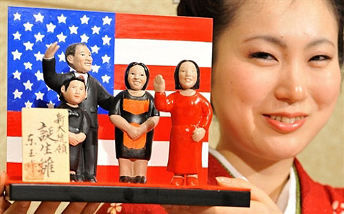 2008年12月11日,在日本東京全日空洲際酒店,日本傳統(tǒng)玩偶制造商Togyoku推出2008年度新聞娃娃(kawaribina),藉此以反應(yīng)這一年來全球所發(fā)生的新聞事件。這批玩偶包括奧巴馬全家慶祝當(dāng)選美國總統(tǒng)的玩偶和獲得2008年諾貝爾獎的日本科學(xué)家玩偶。