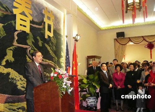 中國駐美大使周文重于當(dāng)?shù)貢r間17日晚在駐美使館華僑華人春節(jié)招待會上致辭時表示,展望處于復(fù)雜而深刻變化的二00九年,中美都面臨機(jī)遇和挑戰(zhàn),中方愿與美方一道推動中美關(guān)系穩(wěn)步發(fā)展。當(dāng)晚的招待會共有七百多名來自一百六十多個僑社的華僑華人出席。中新社發(fā) 覃展鵬 攝