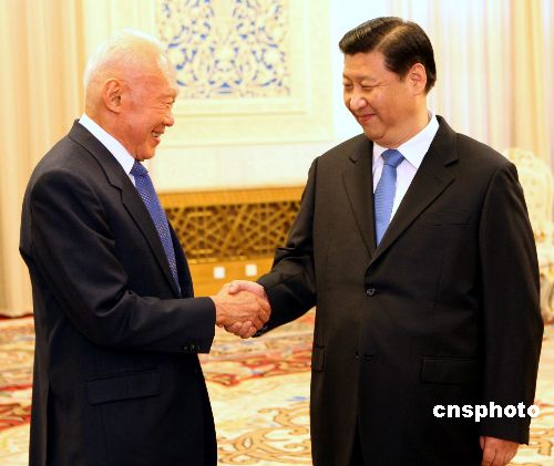 十一月十六日,中共中央政治局常委、書記處書記習近平在北京人民大會堂會見來訪的新加坡內閣資政李光耀。中新社發 任海霞 攝
