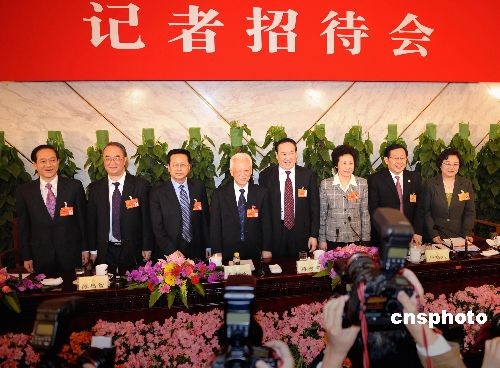 三月六日下午,全國政協(xié)十一屆一次會(huì)議記者招待會(huì)在北京人民大會(huì)堂新聞發(fā)布廳舉行,主題是“民主黨派中央主席談多黨合作”。九三學(xué)社中央主席韓啟德、農(nóng)工黨中央主席桑國衛(wèi)、民建中央主席陳昌智、民革中央主席周鐵農(nóng)、民盟中央主席蔣樹聲、民進(jìn)中央主席嚴(yán)雋琪、致公黨中央主席萬鋼、臺(tái)盟中央主席林文漪(從左至右)共同亮相,受到中外媒體的熱烈關(guān)注。中新社發(fā) 廖攀 攝