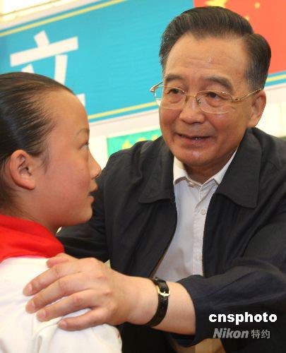 5月23日上午9時(shí)許,國(guó)務(wù)院總理溫家寶來(lái)到四川綿陽(yáng),在九洲帳篷學(xué)校看望地震災(zāi)區(qū)學(xué)生。中新社發(fā) 趙振清 攝