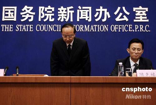 5月23日,在國務(wù)院新聞辦公室就四川汶川地震災(zāi)害和抗震救災(zāi)情況舉行的第十二次發(fā)布會(huì)上,四川省副省長李成云鞠躬感謝全國人民的支持。中新社發(fā) 杜洋 攝