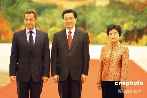 8月8日中午,中國國家主席胡錦濤和夫人劉永清在北京人民大會堂為出席北京奧運(yùn)會的貴賓舉行歡迎宴會。圖為胡錦濤夫婦歡迎法國總統(tǒng)薩科齊。中新社發(fā) 任海霞 攝