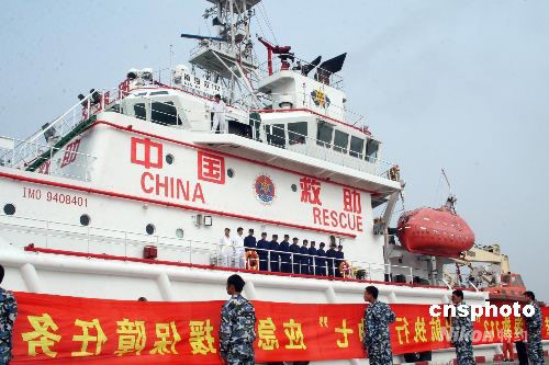 9月21日下午,中國裝備最先進、救助功能最全的大馬力遠(yuǎn)洋專用救助船“南海救一一二”輪一切準(zhǔn)備就緒,從上海外高橋碼頭出征西太平洋海域,待命深海執(zhí)行神舟七號載人航天飛行任務(wù)海上應(yīng)急救援任務(wù)。中新社發(fā) 陸從兵 攝