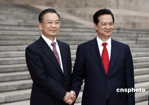 10月22日,中國(guó)國(guó)務(wù)院總理溫家寶在北京人民大會(huì)堂東門(mén)外廣場(chǎng)舉行儀式,歡迎越南總理阮晉勇。中新社發(fā) 盛佳鵬 攝