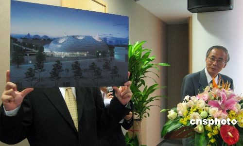 十月二十八日,上海世博會日本展區總代表、日本國經濟產業省顧問塚本弘(右)在上海公布中國2010年上海世博會日本館方案。上海世博會日本館以“心之和、技之和”為主題,展館占地面積達六千平方米,比照以往日本赴海外參展世博會的建設案例,上海世博會日本館的展出規模之大,可謂史無前例。中新社發 許曉青 攝