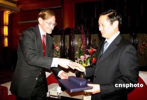 12月14日,世界銀行行長佐利克一行在成都會見了四川省委書記劉奇葆,兩人就全球經(jīng)濟(jì)危機影響下雙方在四川災(zāi)后重建和成都統(tǒng)籌試驗區(qū)建設(shè)等方面的合作意愿交流了看法。圖為佐利克(左)與劉奇葆(右)互贈禮物。中新社發(fā) 黃永莉 攝