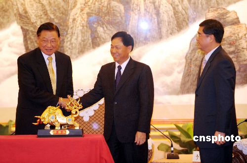 一月七日,深圳市委常委李意珍(中)會見并宴請臺灣海峽交流基金會董事長江丙坤一行。中新社發 陳文 攝
