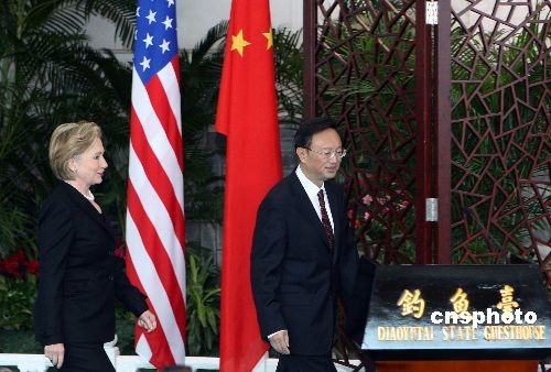 2月21日中午,中國外交部部長楊潔篪與美國新任國務卿希拉里·克林頓在北京釣魚臺國賓館舉行會談后共同會見記者,介紹中美雙方會談情況并回答媒體提問。中新社發 任晨鳴 攝