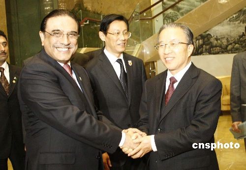 2月21日晚,中國(guó)國(guó)務(wù)委員戴秉國(guó)代表中國(guó)政府在武漢會(huì)見了到訪的巴基斯坦總統(tǒng)扎爾達(dá)里。應(yīng)中國(guó)政府邀請(qǐng),20日至23日,扎爾達(dá)里總統(tǒng)將先后訪問(wèn)湖北和上海,考察中國(guó)水利、農(nóng)業(yè)、金融等領(lǐng)域發(fā)展情況。中新社發(fā) 艾啟平 攝