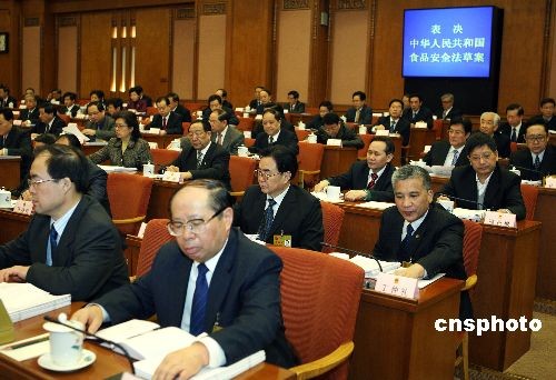 2月28日上午,十一屆全國人大常委會第七次會議在北京人民大會堂舉行閉幕會,以158票贊成、3票反對、4票棄權通過倍受關注的《中華人民共和國食品安全法》。中新社發 任晨鳴 攝