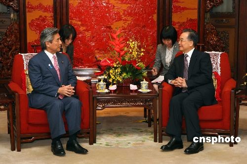 3月1日,中國國務(wù)院總理溫家寶在北京中南海紫光閣會(huì)見日本外相中曾根弘文。中新社發(fā) 盛佳鵬 攝