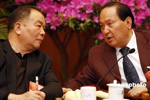 3月5日下午,十一屆全國人大二次會議審議政府工作報告,圖為新疆自治區黨委書記王樂泉與全國人大常委會副委員長司馬義·鐵力瓦爾地在新疆代表團討論會上交談。中新社發 盛佳鵬 攝