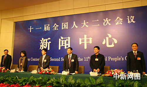 3月6日下午,出席十一屆全國人大二次會議的5位企業家代表在大會新聞中心(梅地亞中心多功能廳)就“企業如何應對國際金融危機的挑戰”接受中外記者的采訪。這五位代表是(從左二起)廣東團代表、廣東省珠海格力電器股份有限公司副董事長、總裁董明珠;黑龍江團代表、黑龍江省哈爾濱泰富公司董事長兼總經理楊天夫;四川團代表、中國東方電氣集團公司董事長、黨組書記王計;浙江團代表、浙江富潤控股集團有限公司黨委書記、董事局主席趙林中;陜西團代表、中國電子信息產業集團董事長、黨組書記熊群力。中新網記者 唐偉杰 攝