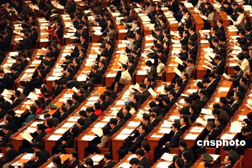 3月9日,十一屆全國人大二次會議在北京人民大會堂舉行第二次全體會議,全國人民代表大會常務委員會委員長吳邦國作全國人民代表大會常務委員會工作報告,代表們細聽“政府工作報告解讀”。中新社發 金立冬 攝