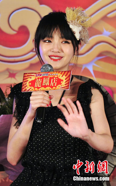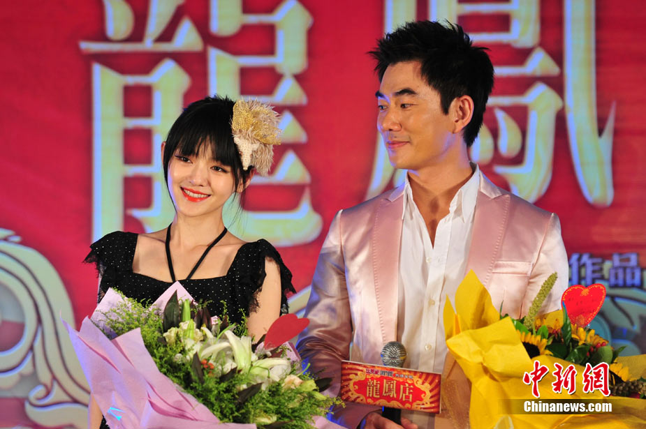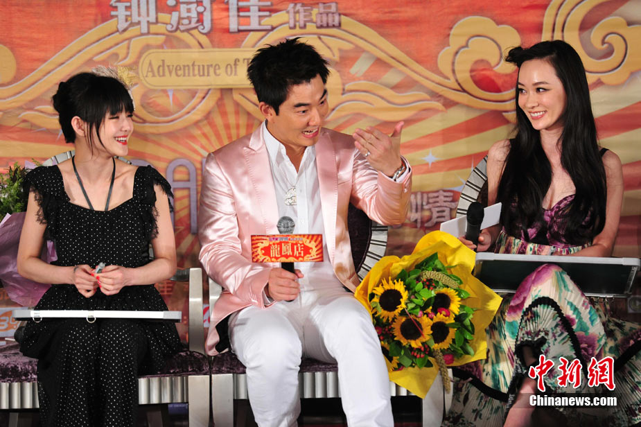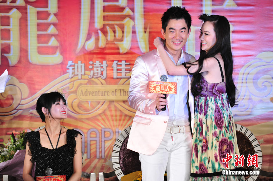 7月30日,古裝愛情喜劇《龍鳳店》在京舉辦官網(wǎng)啟動(dòng)暨終極海報(bào)揭幕發(fā)布會(huì),導(dǎo)演鐘澍佳攜主演任賢齊、大S、霍思燕亮相,臺(tái)灣著名音樂人小蟲前來助陣。大S頭戴“刺猬”發(fā)卡可愛亮相,與任賢齊在現(xiàn)場大談對(duì)唱《龍鳳店》主題曲的感受,大S笑稱唱歌比小S好聽。后來登臺(tái)的霍思燕卻大搶大S風(fēng)頭,她為任賢齊親手戴上禮物項(xiàng)鏈,還親密擁抱久久對(duì)視,兩人在現(xiàn)場大秀親昵立刻成為眾人矚目焦點(diǎn),讓大S在一旁有點(diǎn)沒事做。中新社記者 李學(xué)仕攝