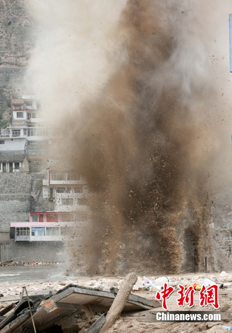 8月10日,蘭州軍區某集團軍“開山斧工兵團”兩次對舟曲災區堰塞湖實施爆破,雖然通過爆破,使河道基本疏通,但效果還不太明顯。11日,蘭州軍區工兵連將繼續爆破,使用炸藥重量也將提高。中新社發 劉忠俊 攝
