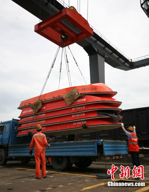 8月21日上午,國家防總緊急調(diào)撥的80艘沖鋒舟,40支橡皮舟、120臺船外機、1萬件救生衣、4000片鉛絲籠網(wǎng)片、4000個鋼絲網(wǎng)兜、500盞查險燈等搶險救災(zāi)物資順利抵達成都火車東站,將立刻分發(fā)運往成都、眉山、樂山、巴中等災(zāi)情嚴重地區(qū)。圖為裝卸工人正在吊裝沖鋒舟。中新社發(fā) 劉忠俊 攝