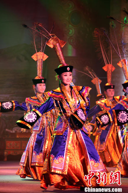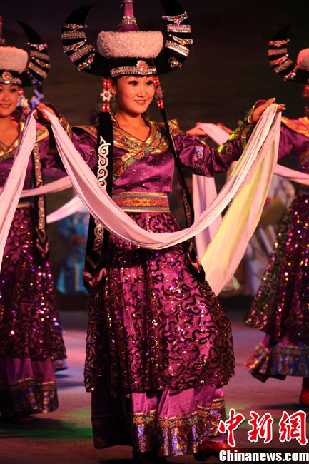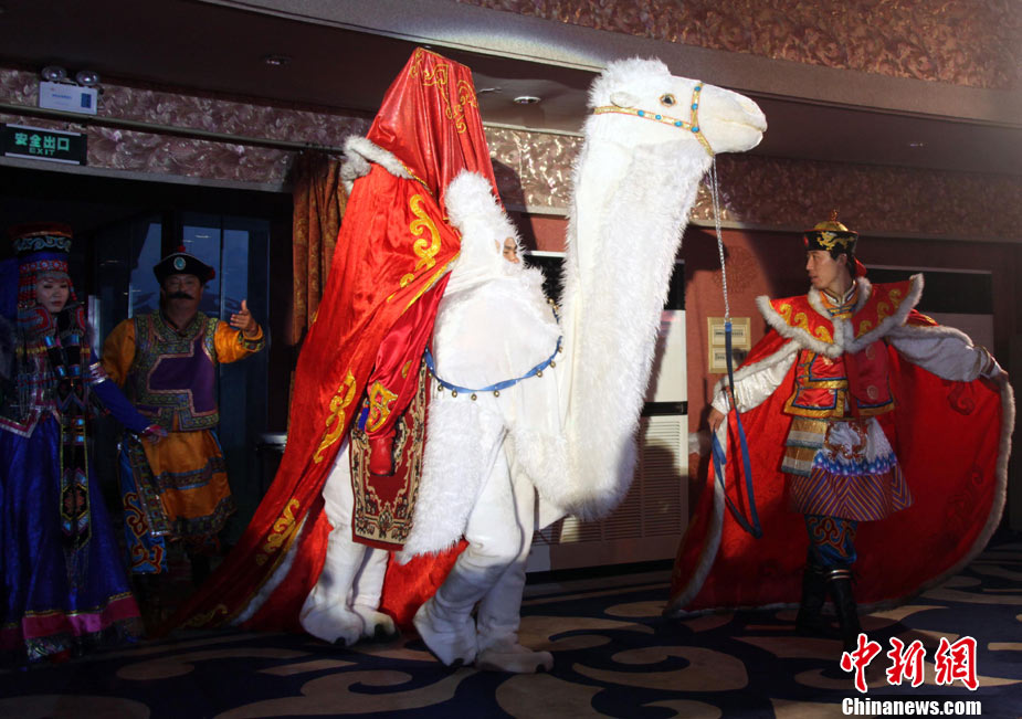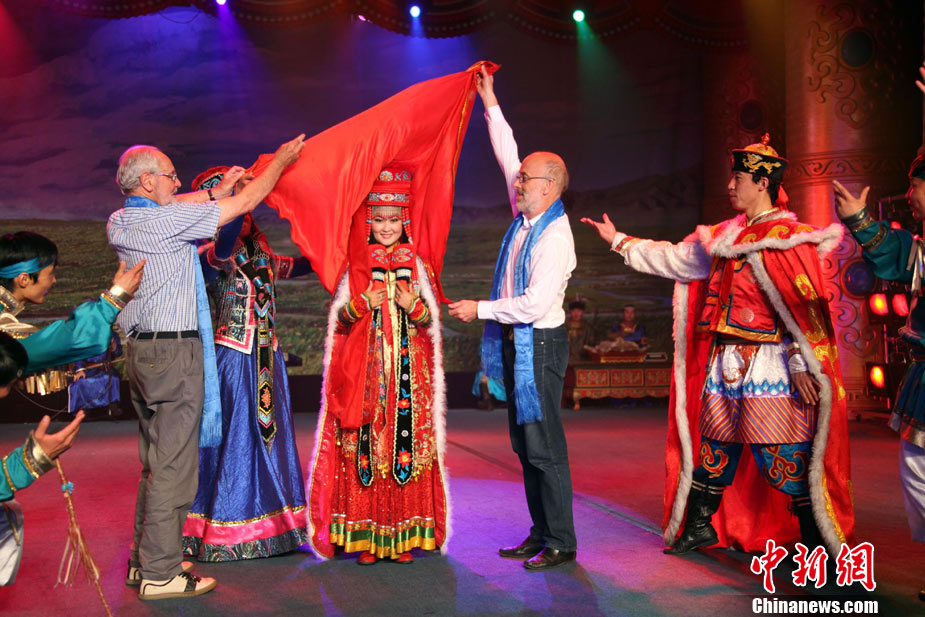8月25日晚,參加“鄂爾多斯青銅器與早期東西方文化交流——北方草原通道”國(guó)際學(xué)術(shù)研討會(huì)的近百位中外考古學(xué)家,觀賞蒙古族傳統(tǒng)婚禮。圖為英國(guó)劍橋大學(xué)馬丁·瓊斯教授(右)、倫敦大學(xué)大衛(wèi)·哈里斯教授擔(dān)任婚禮主婚人,并應(yīng)邀掀開(kāi)新娘子的紅蓋頭。中新社記者 孫自法 攝
