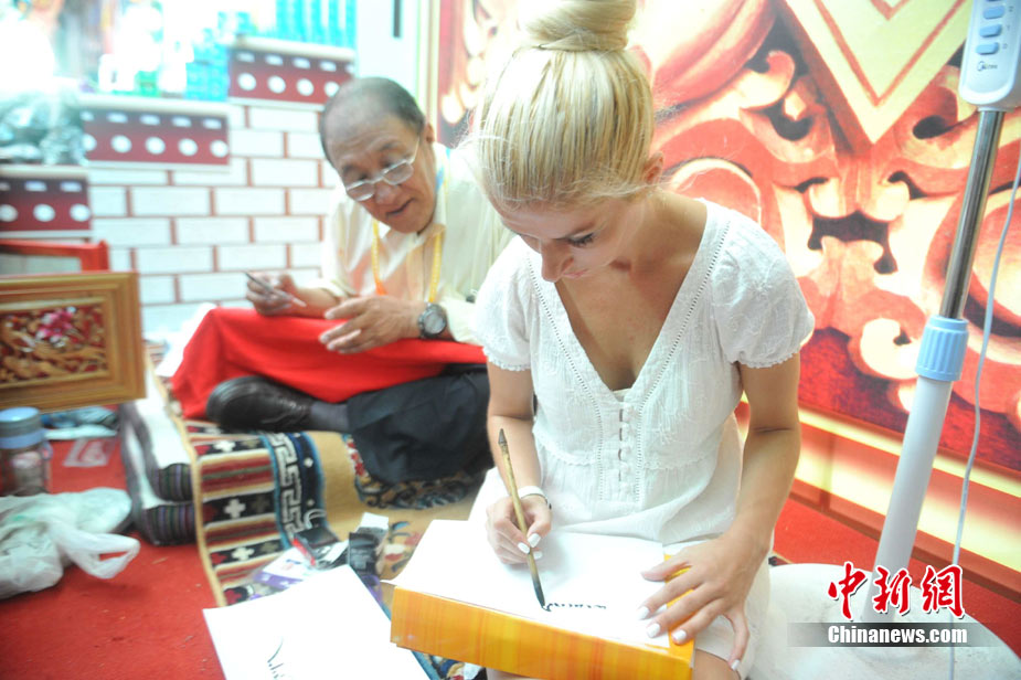 9月3日,上海世博會西藏活動周進入第3天。土耳其姑娘Esmeralda Sinani來到上海世博會寶鋼大舞臺,體驗藏族文化。圖為Esmeralda Sinani在喝酥油茶,并向藏族人吉吉了解酥油茶相關的文化。 中新社記者 蔣雪林 攝