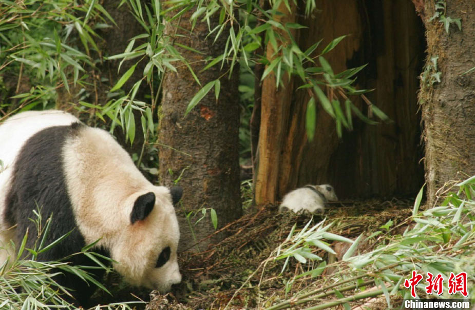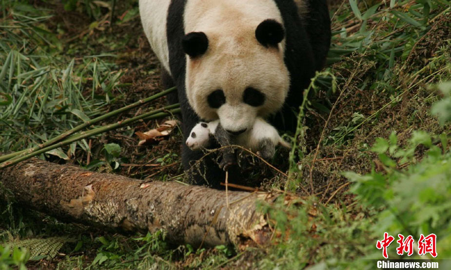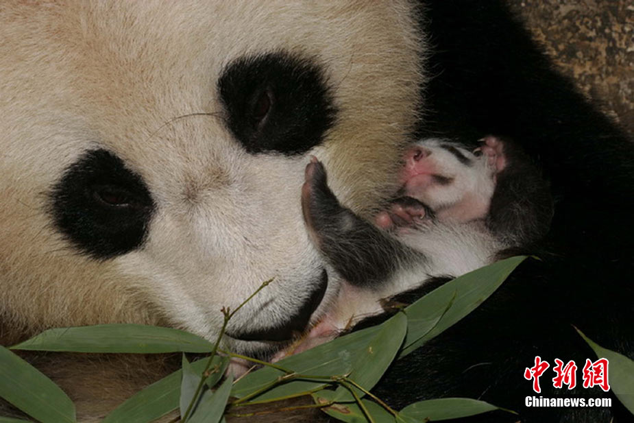 9月4日從臥龍中國保護大熊貓研究中心獲悉,全球首只在野化培訓基地誕生的大熊貓寶寶----“草草”的幼仔已滿月。在8月3日降生于臥龍“核桃坪”野化培訓基地后的一個月里,科研人員按預先計劃順利開展了相關研究工作,讓“草草”帶著寶寶先在一個條件相對簡單的環境中生活,目前,幼仔生長狀況良好,從出生時的205克增長到了1235克,身體健康,活力強。中新社發 曾昌霞 攝