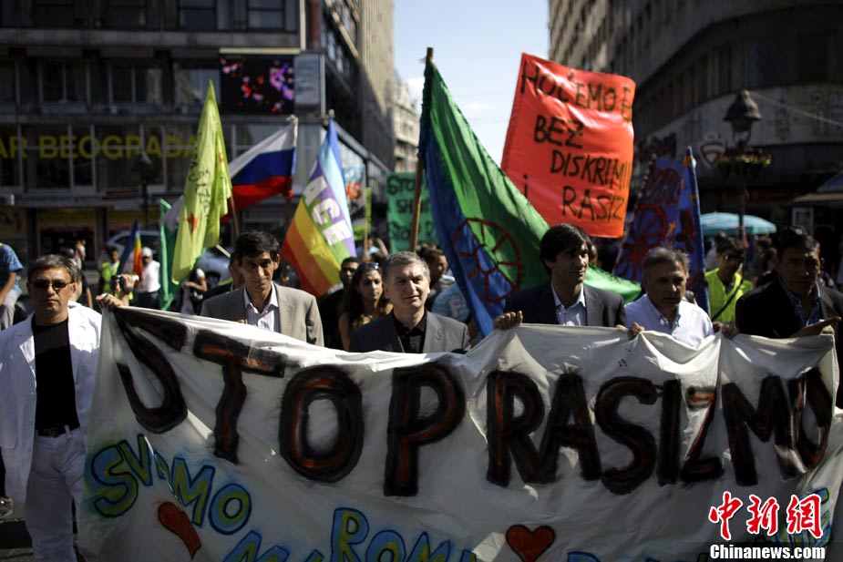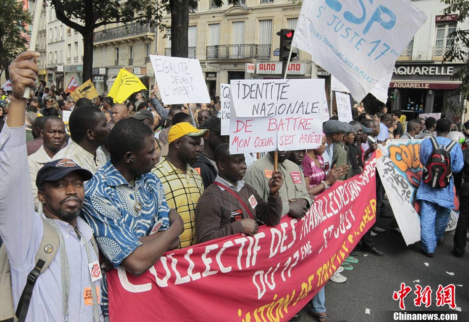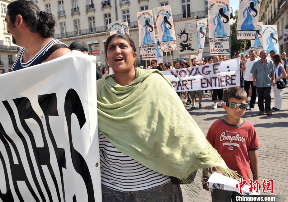 法國全國各地4日有數以萬計的群眾上街示威,抗議政府最近采取新政策,強行驅逐吉卜賽人出境。歐洲其它城市包括貝爾格萊德和羅馬,也有群眾游行聲援吉卜賽人。圖為在法國南特,民眾示威抗議政府強行驅逐吉普賽人。