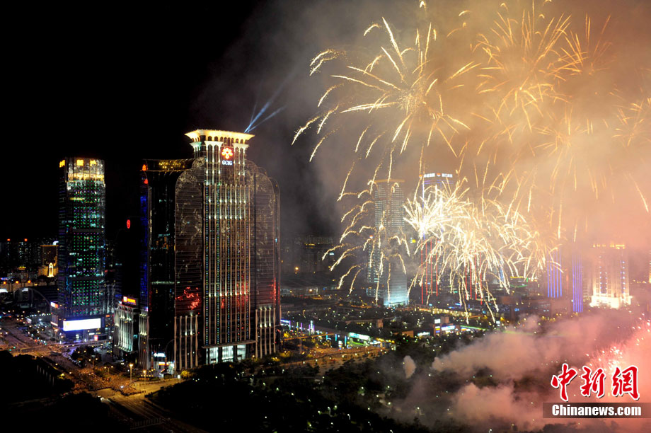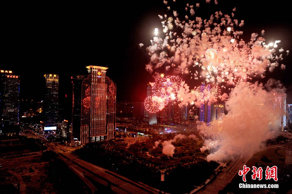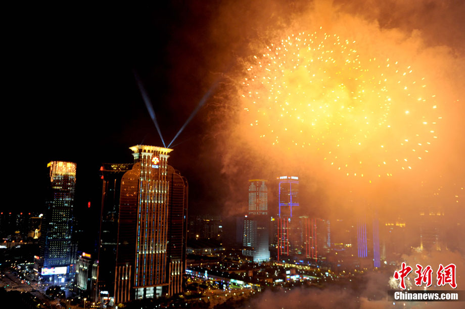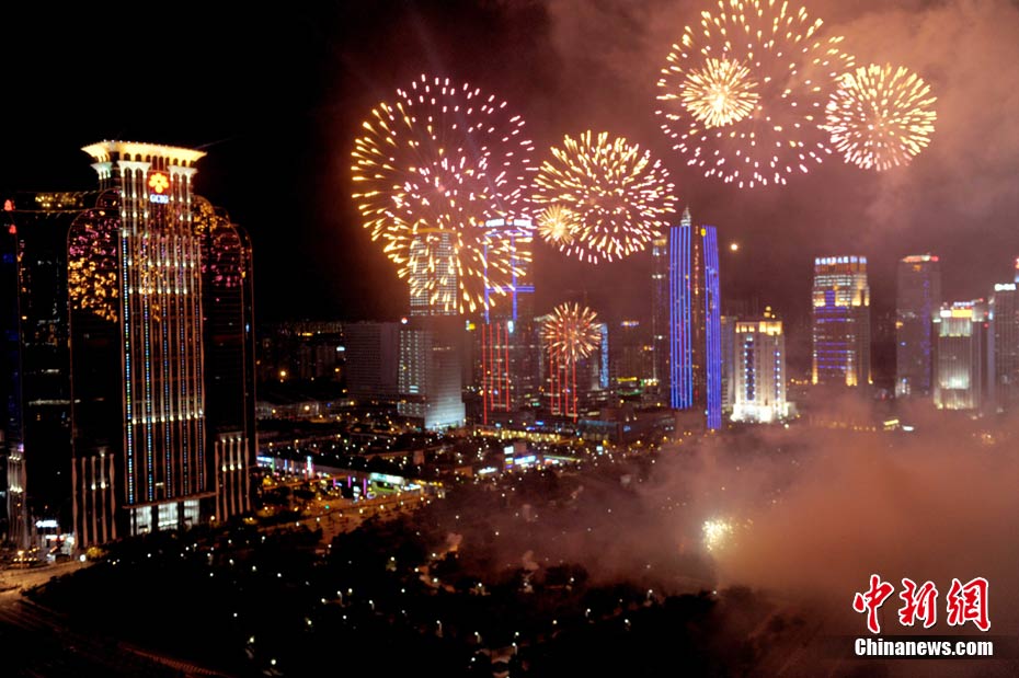 9月6日晚8點30分,深圳夜空璀璨絢麗,慶祝深圳經濟特區(qū)建立30周年焰火晚會在深南大道水晶島舉行。今晚燃放煙花數量145107發(fā),主要品種19種,全長30分鐘,共四個樂章。深圳市民分別在蓮花山公園、市民中心、深南路、彩田路、會展中心等區(qū)域觀看深圳經濟特區(qū)30周年慶典煙花晚會。中新社記者 陳文 攝