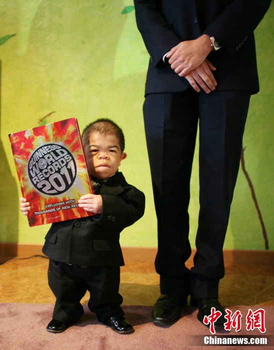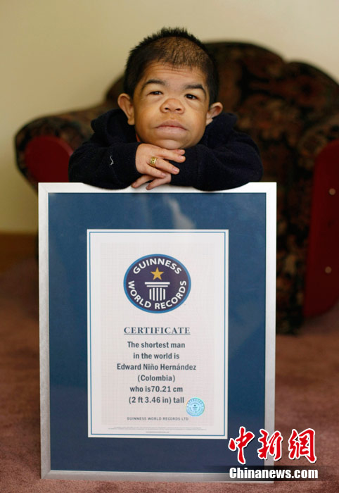身高僅70厘米的哥倫比亞男子愛德華·尼科·埃爾南迪斯近期獲得吉尼斯世界紀錄世界最矮男人的稱號。身高為74厘米的前吉尼斯世界紀錄保持者何平平3月13日去世后,吉尼斯紀錄認證官員找到了身高70厘米的埃爾南迪斯。現年24歲的他體重只有10公斤,出生時體重為1.5公斤,體長38厘米。然而,埃爾南迪斯的這個頭銜不會保持太久,尼泊爾少年馬加爾今年10月14日年滿18周歲后,有望取代他成為世界最矮的男人,馬加爾身高僅56厘米。