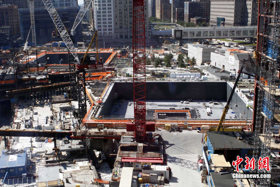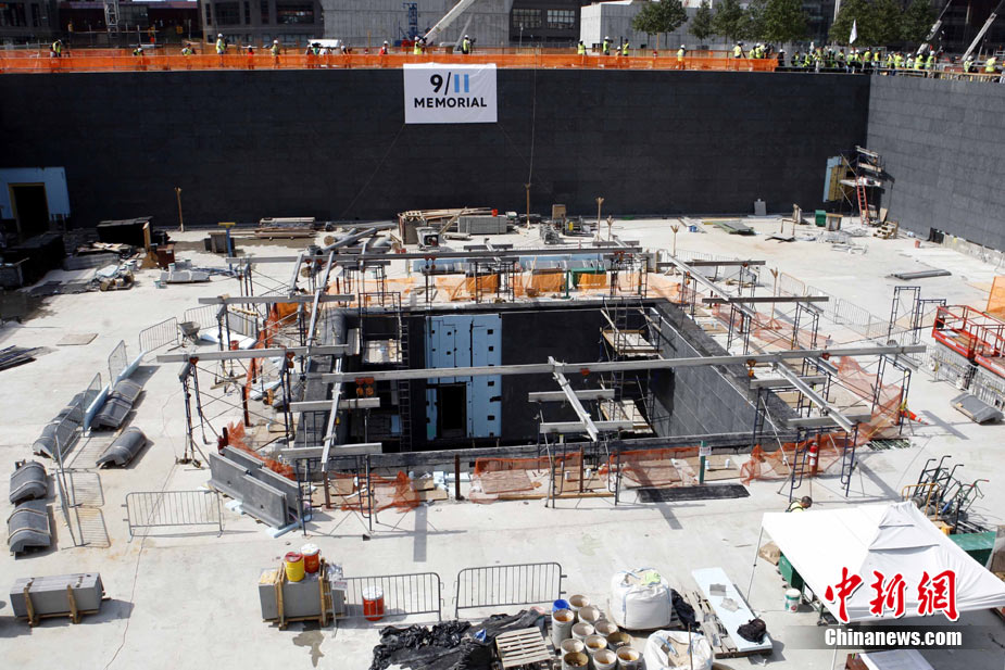 美國(guó)當(dāng)?shù)貢r(shí)間9月7日,記者在紐約世貿(mào)建筑工地現(xiàn)場(chǎng)看到,以原先世貿(mào)雙子塔樓基座為主體的兩個(gè)方形瀑布池業(yè)已成型,周?chē)卜N上了些許綠樹(shù)。9·11紀(jì)念館館長(zhǎng)喬·丹尼爾斯表示,肯定將在事件十周年紀(jì)念日當(dāng)天開(kāi)館。中新社記者 孫宇挺 攝