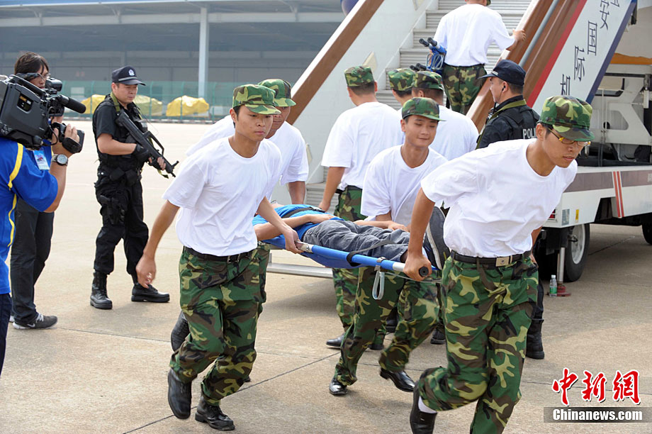 9月16日,深圳寶安國際機場舉行反恐應急演習,模擬一架客機被歹徒劫持后,特警、防爆、消防、醫療救護等各方面展開營救,在短時間內解救人質處理事故。中新社記者 陳文 攝