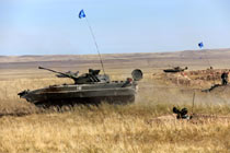 當地時間9月15日,“和平使命-2010”上海合作組織成員國武裝力量聯合反恐軍事演習,按計劃在哈薩克斯坦馬特布拉克訓練場成功進行聯演戰役準備階段的第二次合練——無彈藥消耗全員全裝實兵合練,旨在按演習科目和進程,開展實兵現地推演。圖為參演官兵攻入“恐怖分子”盤踞村鎮。中新社記者 孫自法 攝