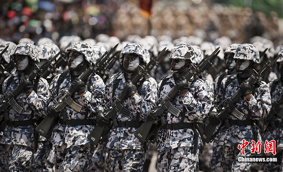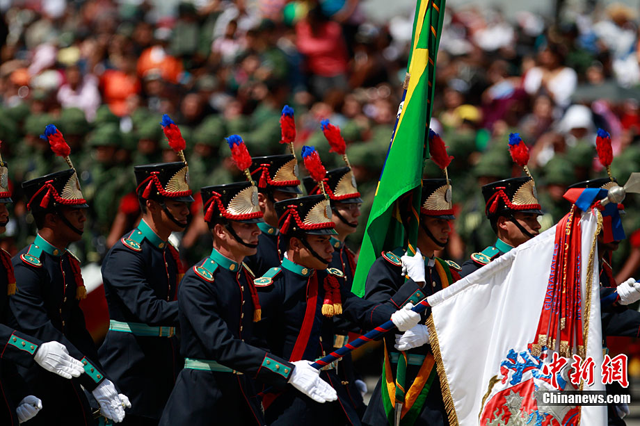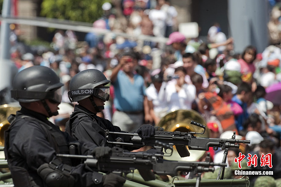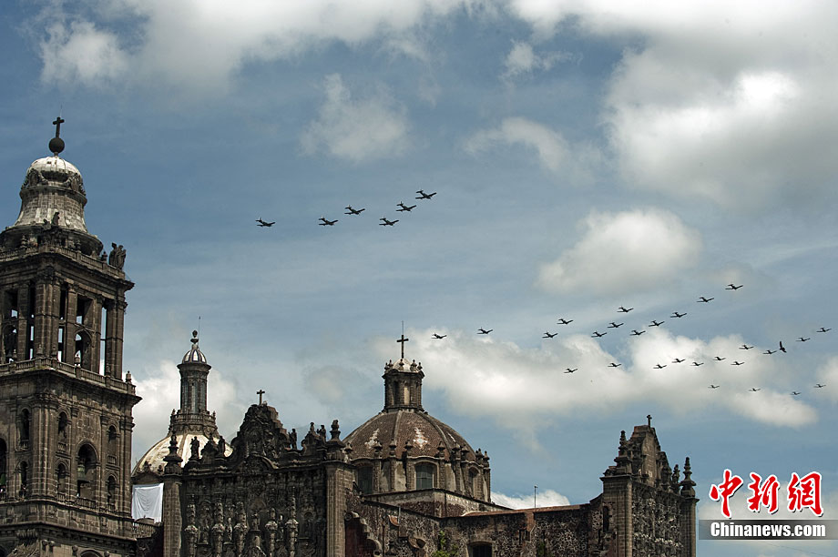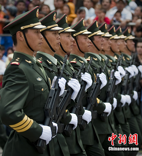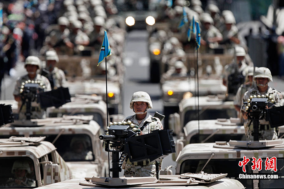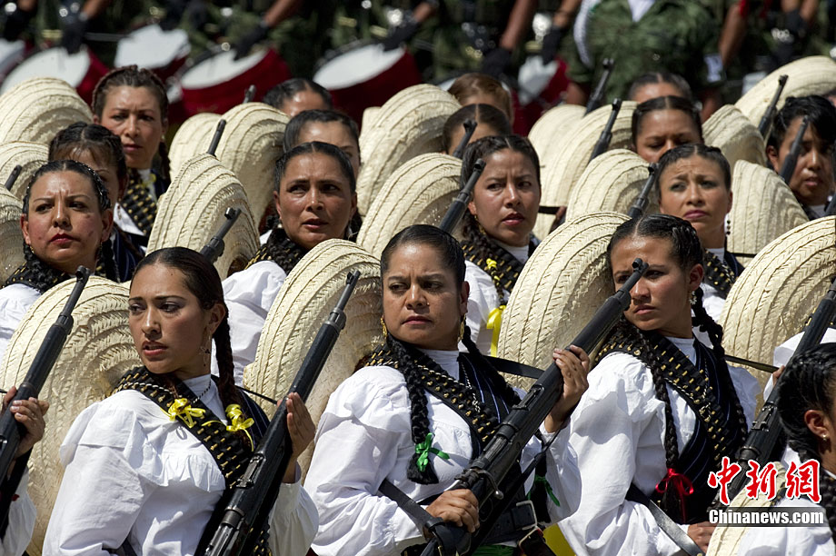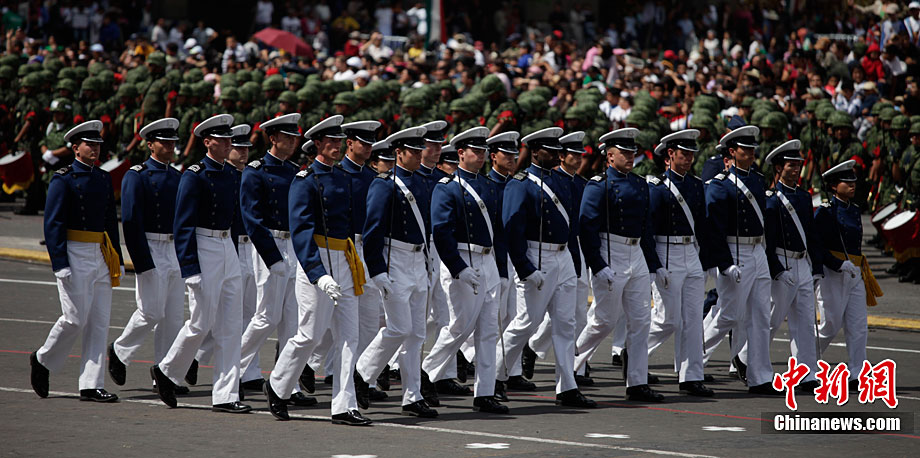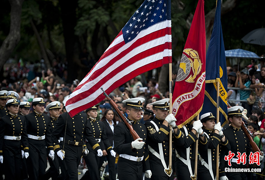 9月16日,在墨西哥首都墨西哥城,中國人民解放軍儀仗方隊參加墨西哥獨立200周年慶典閱兵。參加此次閱兵的中國儀仗隊由36人組成,其中34人編成方陣,最前方是1名旗手、5名護旗手,后隨1名陸軍指揮官,其身后列3隊,陸海空各1列、每列9人。這是解放軍儀仗部隊首次走出國門遠赴海外參加活動。