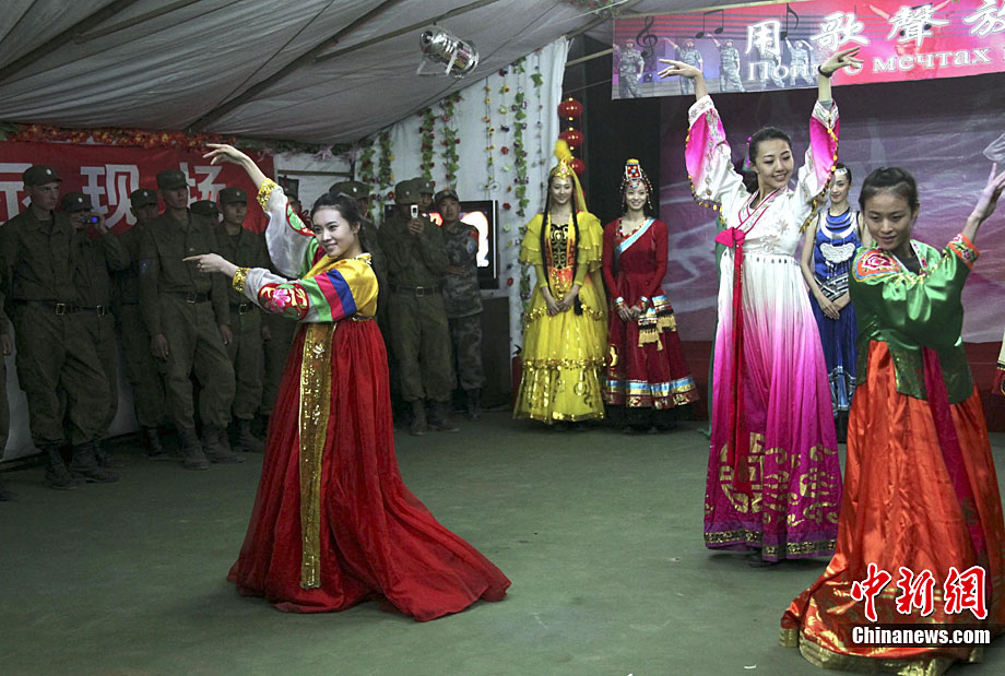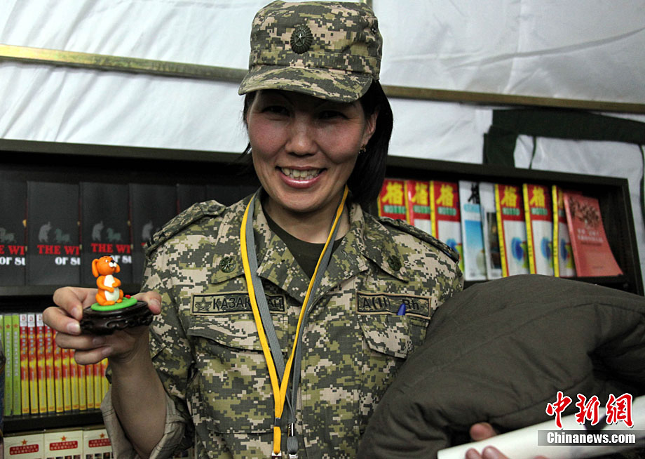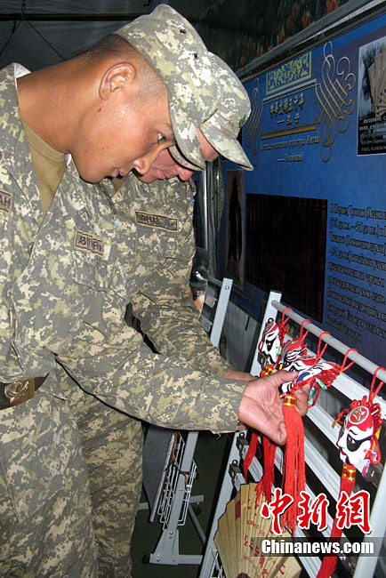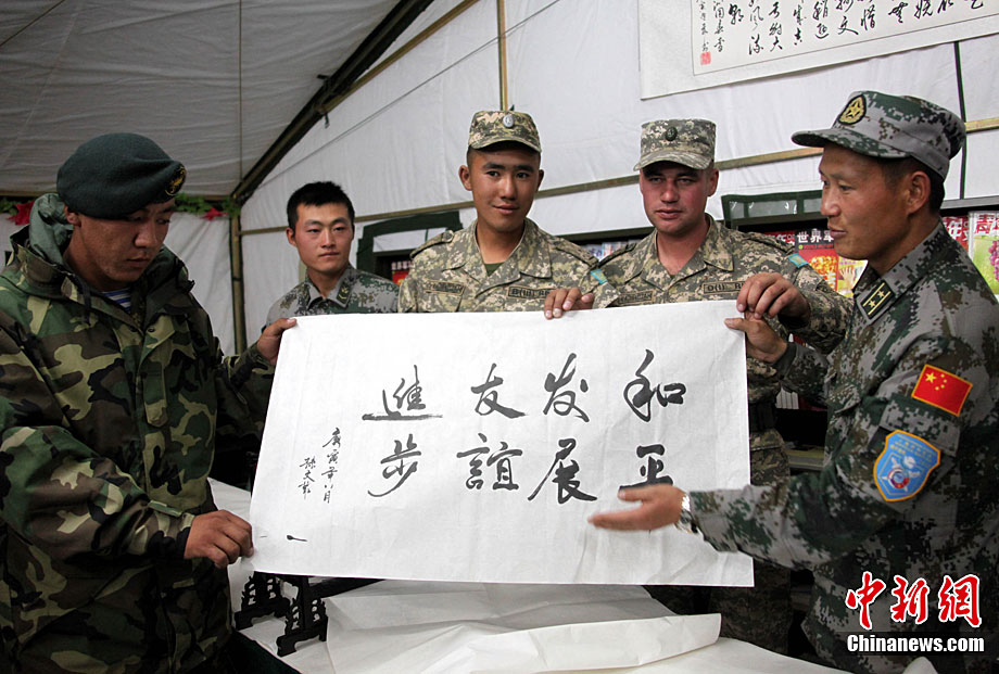 9月20日是“和平使命-2010”聯(lián)演確定的中國(guó)民族文化日,當(dāng)?shù)貢r(shí)間黃昏時(shí)分至晚上,哈薩克斯坦、俄羅斯、塔吉克斯坦、吉爾吉斯斯坦參演部隊(duì)官兵應(yīng)邀先后來(lái)到中方野戰(zhàn)兵營(yíng)內(nèi)的“民族文化屋”帳蓬,觀賞、體驗(yàn)博大精深的中國(guó)文化。圖為中方參演官兵現(xiàn)場(chǎng)揮毫并將書(shū)法作品贈(zèng)送給哈方官兵。中新社記者 孫自法 攝