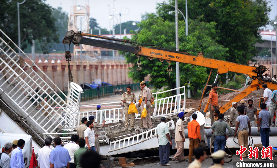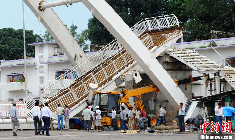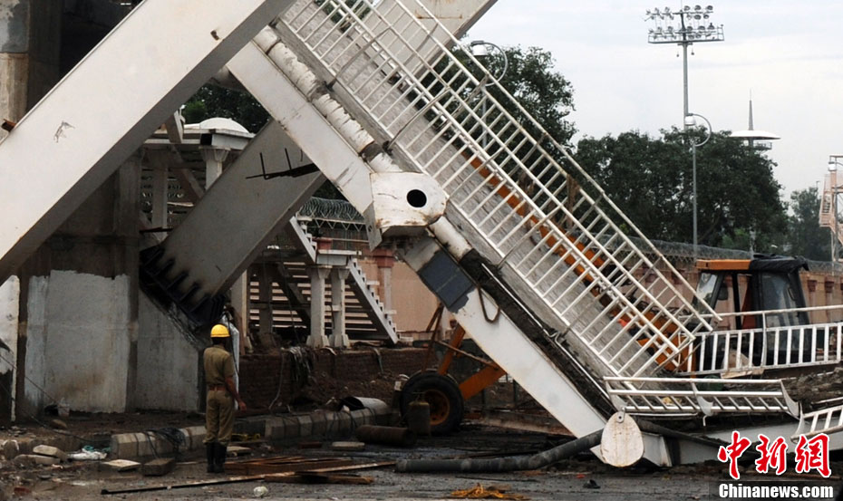 9月21日,印度首都新德里一座正在建造中的過街天橋下午突然坍塌,造成至少26名施工工人受傷,其中5人傷勢嚴重。 印度安全人員和施工工人聚集在倒塌的天橋旁查看情況。