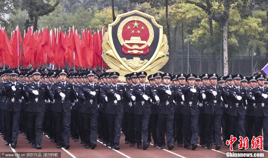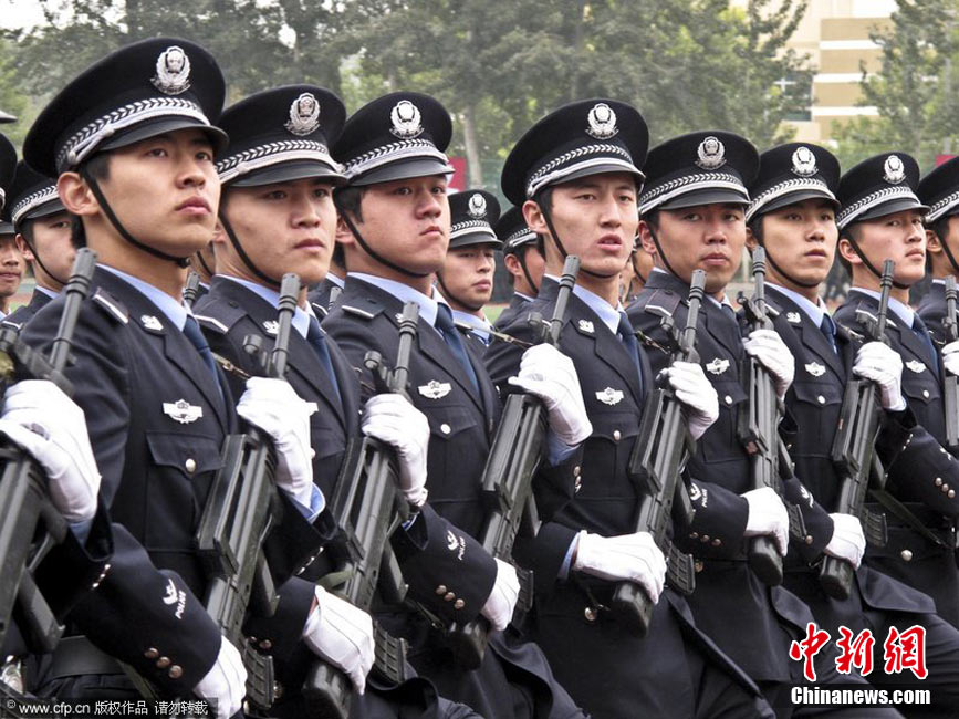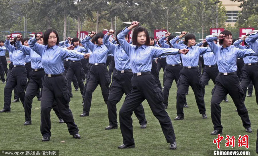 2010年10月20日,中國人民公安大學新生開學儀式在北京大興校區舉行,數百位家長親臨現場,觀摩了孩子們在開學典禮上的表演。圖為女生們表演匕首制敵的招數。蒲東峰 攝 圖片來源:CFP視覺中國