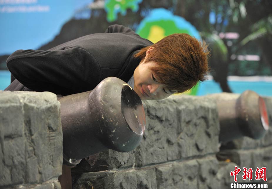 10月29日離上海世博會閉幕還有三天,一位小伙子對加勒比聯合館的古炮臺饒有興趣。中新社記者 賈國榮 攝