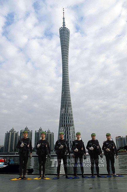 連日來,一支行頭特別的“蛙人”隊伍出現在廣州市番禺亞運城水域,他們身著黑色連體服,肩背氣瓶,腳踏巨大的“腳蹼”,引人注目。